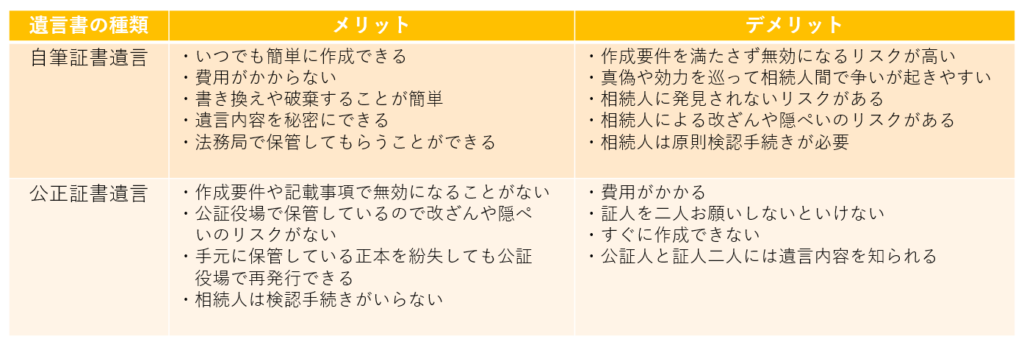 通常、遺言書を作成するにあたり考えるのが、「自筆証書遺言」か「公正証書遺言」どちらで作成するのかです。メリット・デメリットを比較してみましょう。